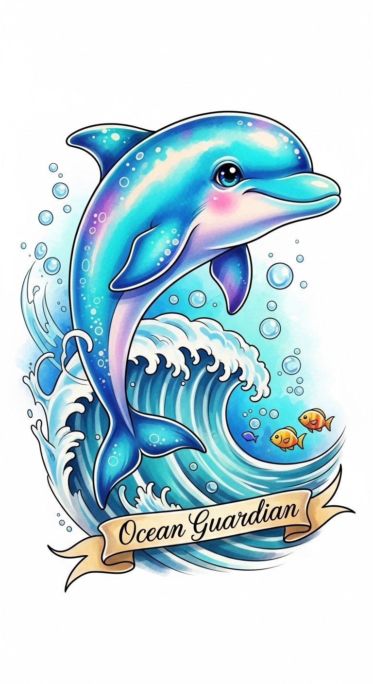This design concept features a small-to-medium dolphin pair in mid-leap, rendered in soft watercolor blues and teal with subtle coral and sunset orange accents; playful bubbles, a scattering of tiny stars, and a delicate wave line wrap around the tail for movement. Symbolically, the dolphins embody joy, freedom, intelligence, and companionship, while the coral/orange hues nod to conservation and the fragile beauty of marine ecosystems. Emotionally the piece is uplifting and whimsical, ideal for wrists, ankles, behind the ear, shoulder blade, or along the ribcage where its flow complements natural curves and invites conversation about ocean stewardship.