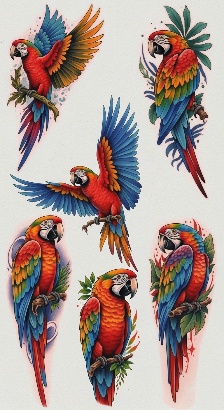 This tattoo concept channels exuberance and movement: a mid-sized parrot in flight rendered with saturated tropical greens, turquoise, ruby red and sunny yellow, accented with watercolor splashes and fine-line feather details to convey motion.