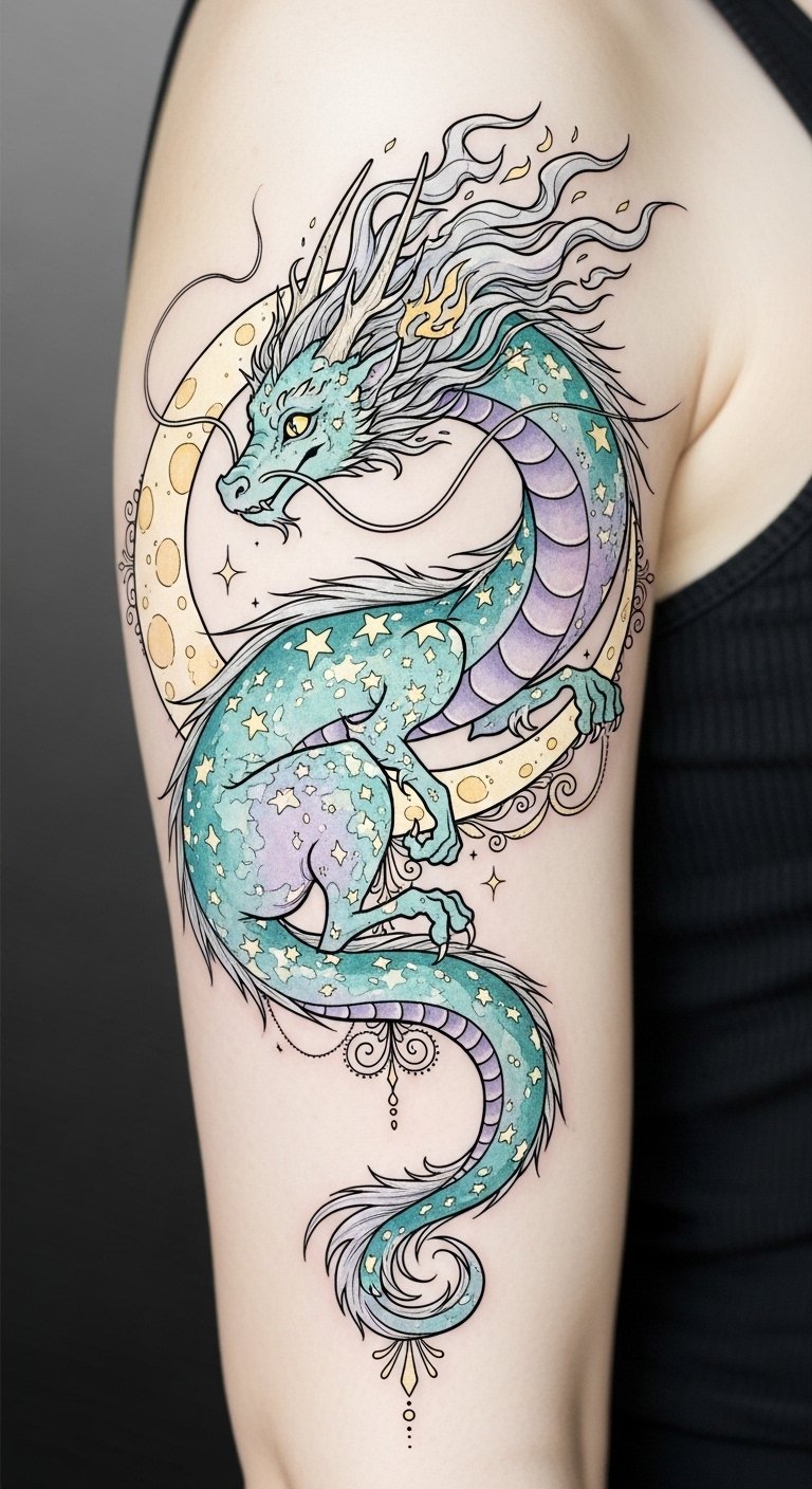 A graceful design marrying fantasy and personal power: the crescent-wrapped dragon symbolizes balance between night and inner fire, the star-like scales and watercolor palette evoke wonder and imagination, while the playful expression keeps the piece whimsical rather than menacing.