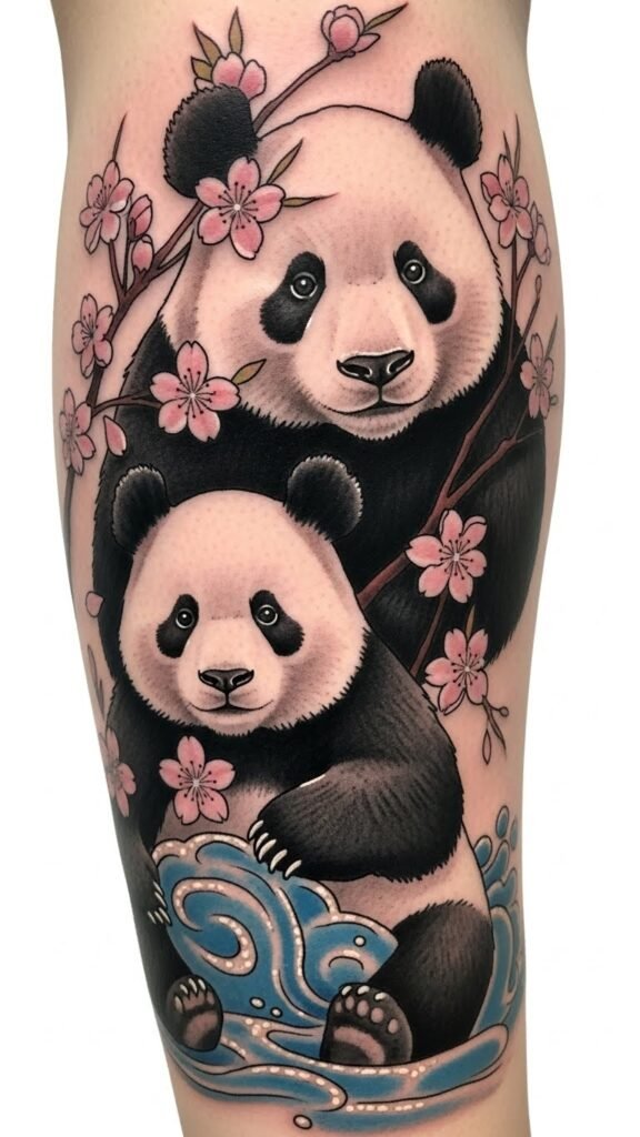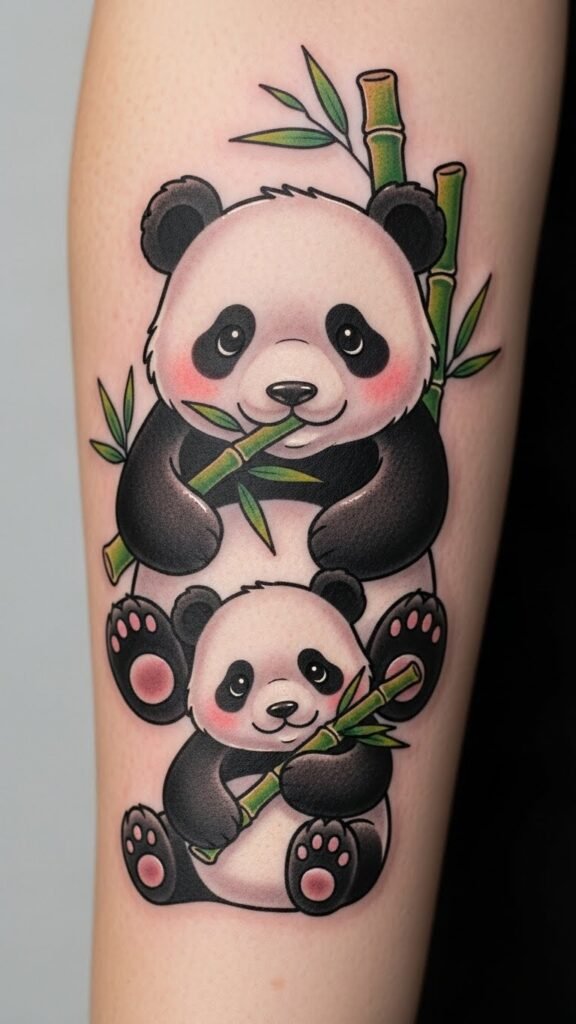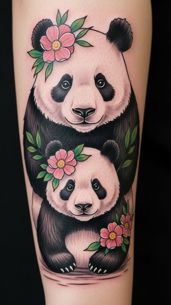 These adorable panda elements symbolize gentleness, balance, and playful innocence, evoking warmth and a lighthearted spirit; placed on the wrist, ankle, or behind the ear the design feels intimate and personal, conveying charm without overwhelming, perfect for someone who wants a small, whimsical reminder of joy and calm in everyday life.