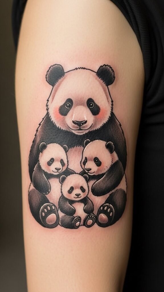 When placed on the inner forearm, upper back, or ribcage, this design uses soft, rounded lines and gentle shading to evoke tenderness—two larger pandas cradling a playful cub between them, subtle bamboo accents framing the scene, and a faint watercolor wash in muted greens and grays to suggest a tranquil bamboo grove.