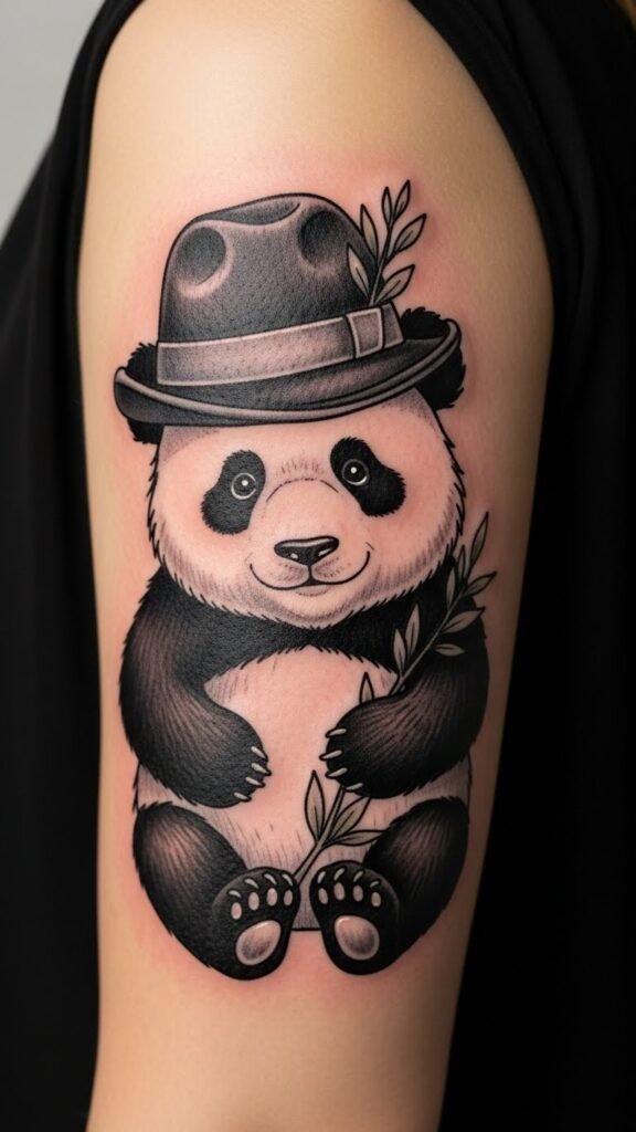 This design symbolizes innocence, joy, and a lighthearted bond with nature; the panda’s playful expression and stylish hat convey personality and whimsy, inviting warmth and smiles.