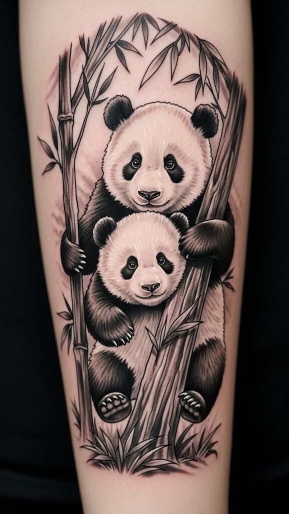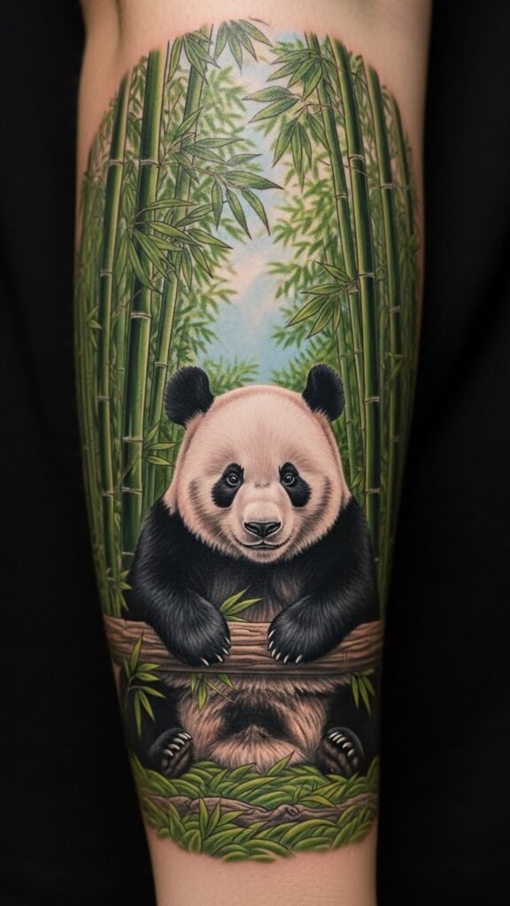 This tattoo design centers a peaceful panda cradled among detailed bamboo stalks and leaves, using soft black-and-gray shading with selective muted green accents to highlight foliage; symbolize tranquility, friendship, and conservation, evoking calm and a protective emotional tone; ideal placements include the upper arm, calf, or across the shoulder blade where the composition can flow with body contours and allow for medium scale detail.