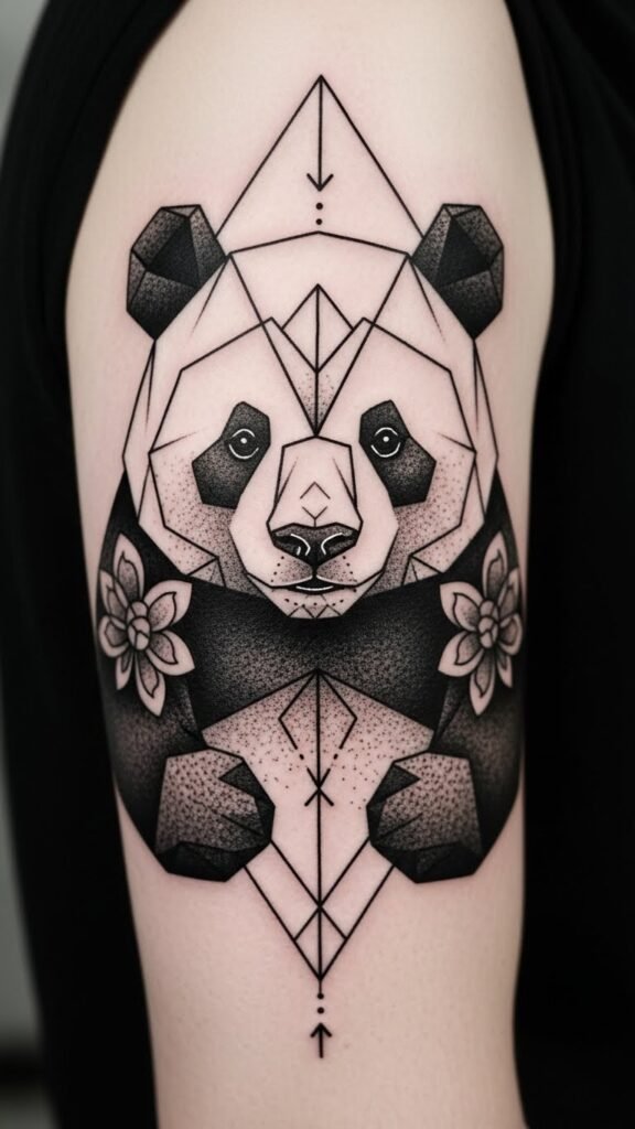 This design symbolizes harmony between strength and gentleness, using precise geometry to express balance and inner calm; the crisp lines and bold angles convey confidence while the panda motif brings warmth and approachability.