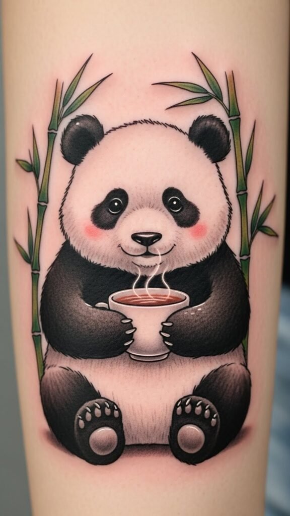 This design symbolizes peacefulness, comfort, and appreciation for small pleasures; the panda’s gentle expression and tea cup convey mindful presence while the bamboo adds resilience and growth. Emotionally, it evokes warmth, calm, and a whimsical serenity that can soothe during stressful moments. Ideal placements include the inner forearm, shoulder blade, calf, or ribcage where the scene can be displayed horizontally or slightly curved to follow the body’s contours, allowing fine line detailing and soft shading to enhance the cozy atmosphere.
