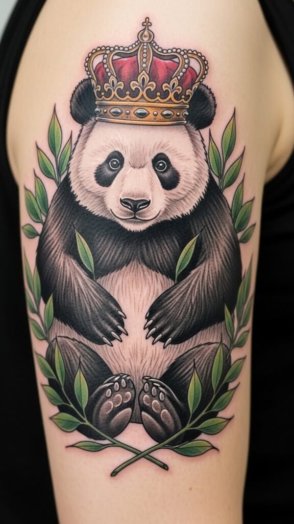 This design symbolizes a balance of serenity and resilience: the panda’s calm gaze and soft expression convey peace and gentle strength, while the realistic shading underscores depth and lifelike presence. Emotionally, it evokes comfort, playfulness, and a rooted connection to nature—ideal for someone seeking a reminder to stay grounded and compassionate. Recommended placements include the upper arm, shoulder blade, or chest where the portrait’s detail can be showcased and viewed both as intimate personal emblem and striking public art.