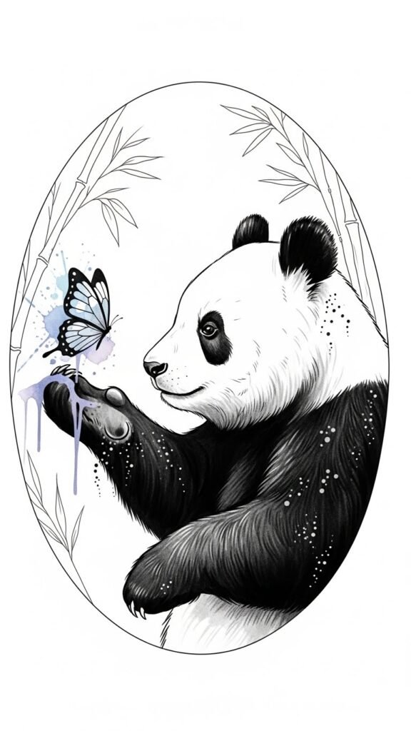This artistic interpretation highlights panda symbolism of tranquility and resilience alongside butterfly meanings of change and freedom.