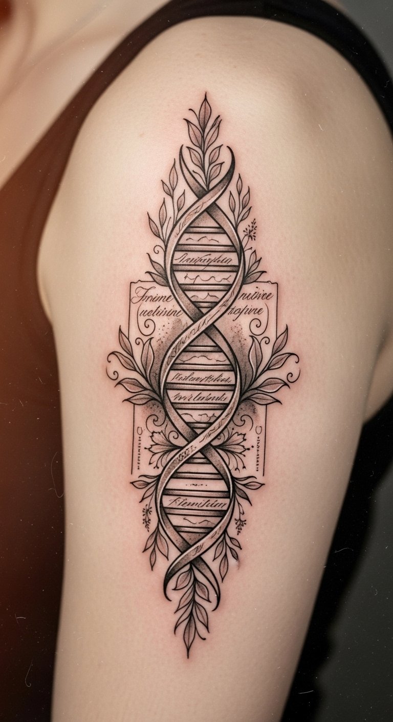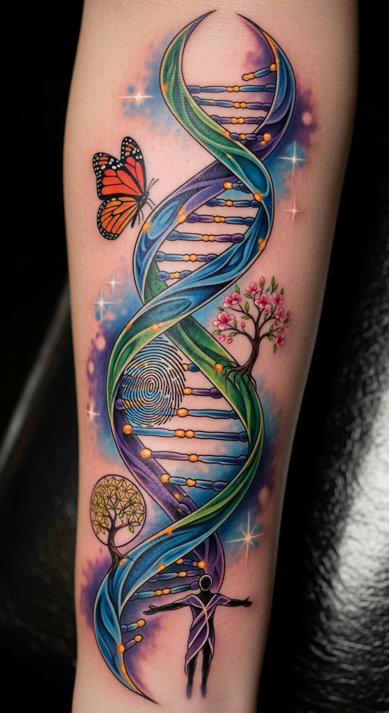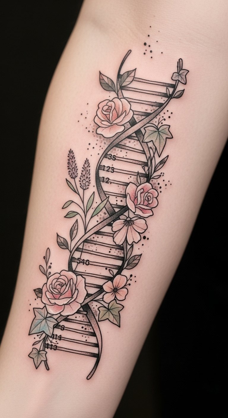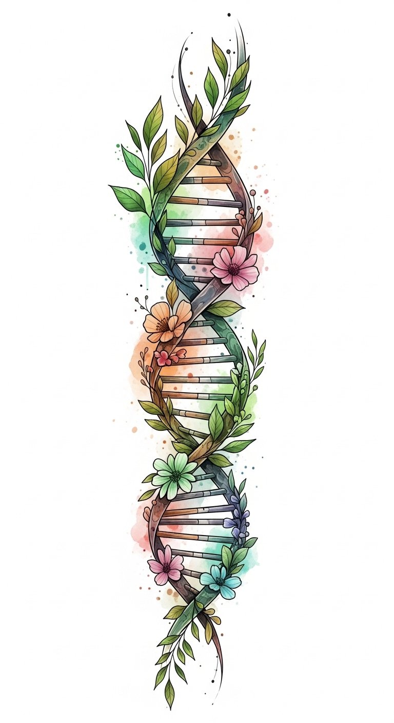 Looking for a tattoo that truly represents who you are? DNA tattoos offer a stunning blend of artistry and personal significance, making them perfect for self-expression. Whether you’re drawn to realistic double helix designs or minimalist line art, each tattoo tells a unique story. Imagine showcasing your heritage or honoring loved ones through intricate patterns and vibrant colors. Let’s explore some breathtaking ideas that might just inspire your next ink masterpiece. This design symbolizes the fusion of identity (DNA helix) with growth and memory (botanical motifs and watercolor), evoking pride, connection, and resilience; emotionally it balances scientific precision with artistic fluidity, and works well on the forearm, ribs, or calf where the helix can follow natural contours for a dynamic, intimate placement.