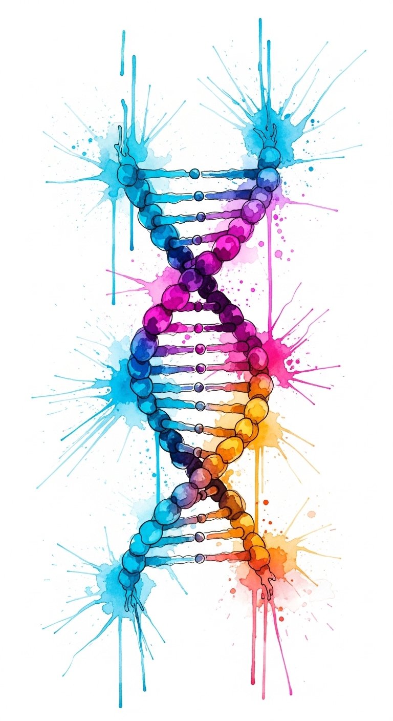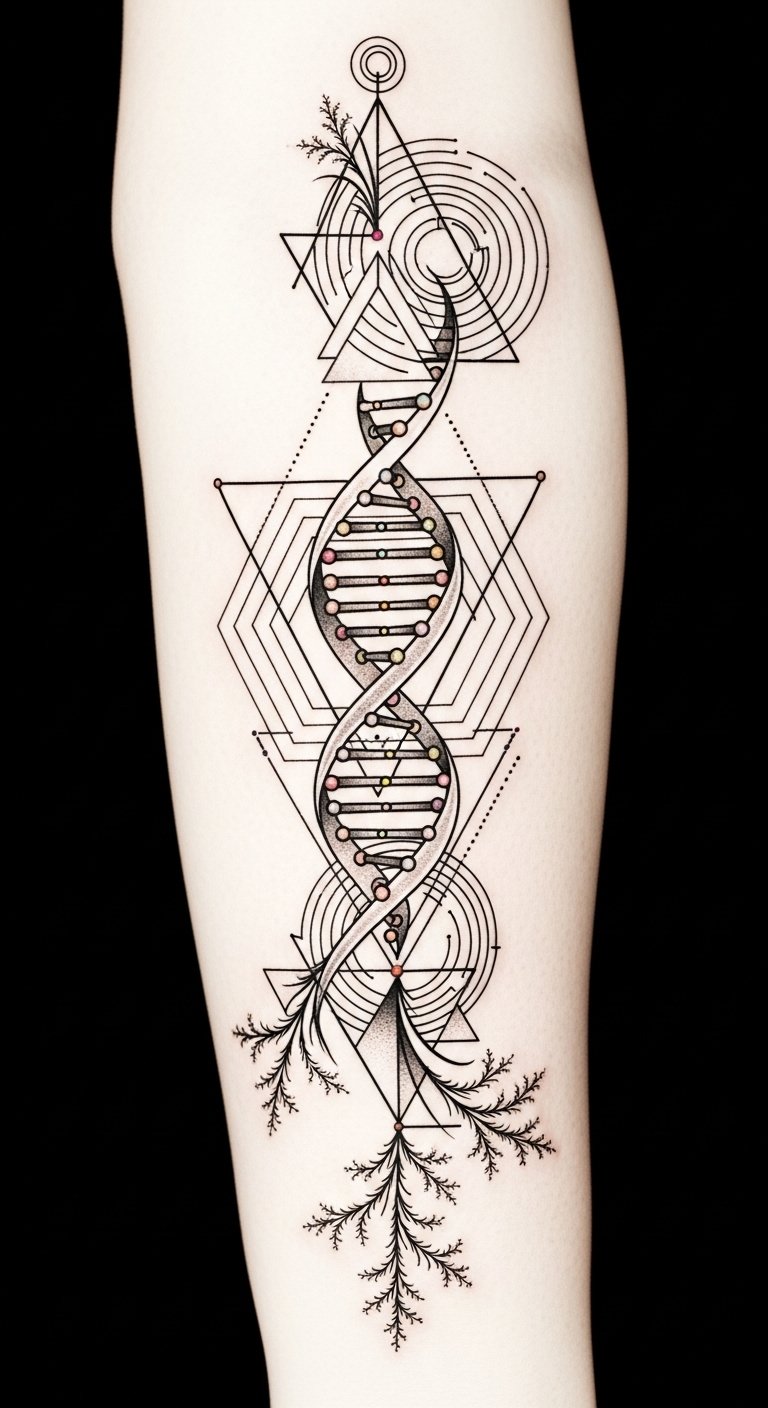 This design concept translates the original text into a tattoo that merges scientific elegance with modern geometry: a stylized double helix built from angular polygons and tessellated motifs, layered with subtle fractal repeats and faint 3D shading; contrasting colors accentuate alternating strands while negative space forms linear arrangements that flow with the body. Symbolically it represents identity, continuity, and the interplay of order and creativity; emotionally it feels both precise and expressive—perfect for a forearm wrap, along the spine, or curving over the ribcage where movement animates the fractal rhythm.
