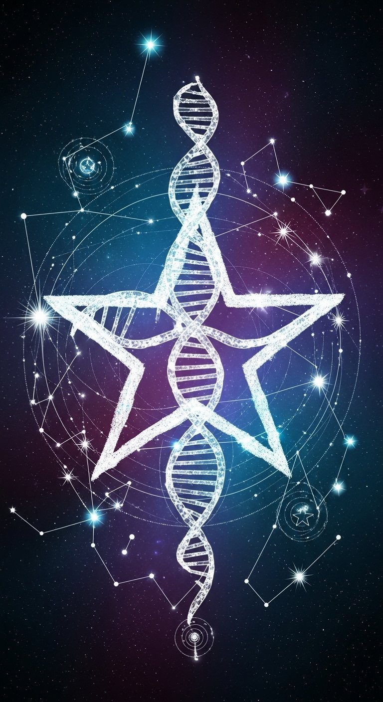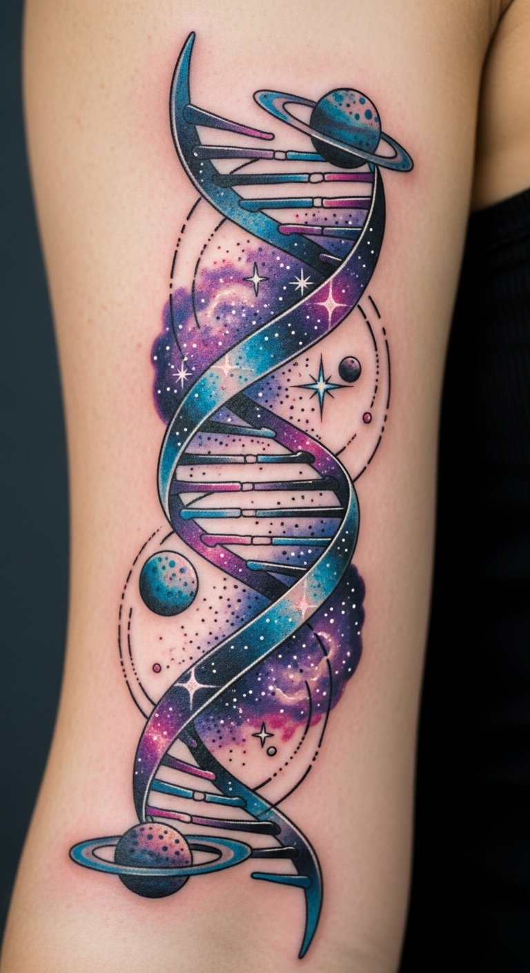 This design blends double-helix strands with delicate constellation lines and tiny stars, symbolizing the connection between personal ancestry and the wider cosmos; emotionally it evokes wonder, identity, and continuity, making it suitable for intimate placements like the inner forearm, collarbone, or along the ribcage where it can be both private and visible as desired.