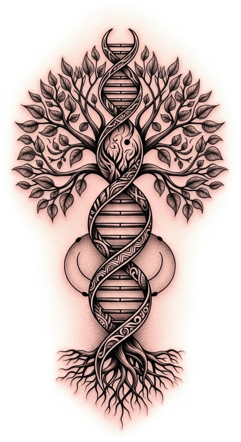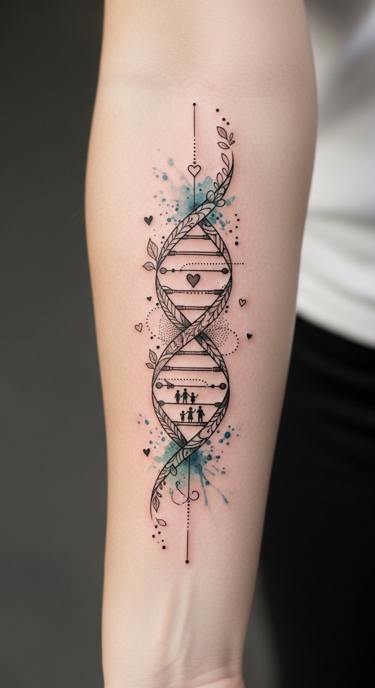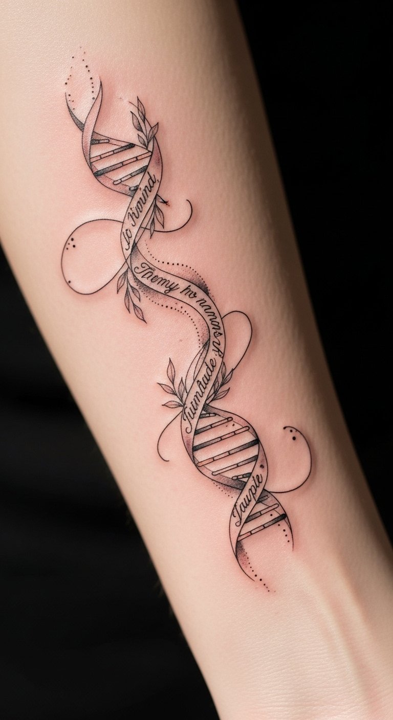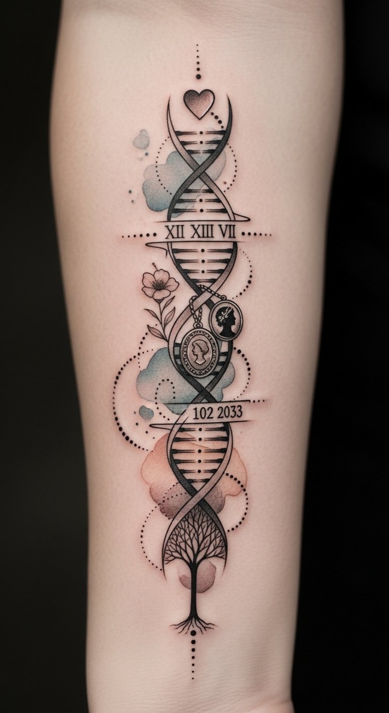The design merges scientific form and personal iconography to symbolize lineage, memory, and growth; emotionally it feels intimate, grounding, and celebratory, suitable for placement along the inner forearm or collarbone where it can be both visible and private, wrapping subtly with the body’s contours to suggest continuity across generations.