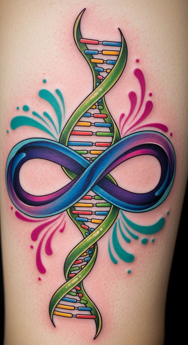 The design blends eternal continuity and biological identity: a flowing infinity loop formed by a delicate double helix, with one strand shaded in bold color and the other in fine black linework to balance vibrancy and subtlety.