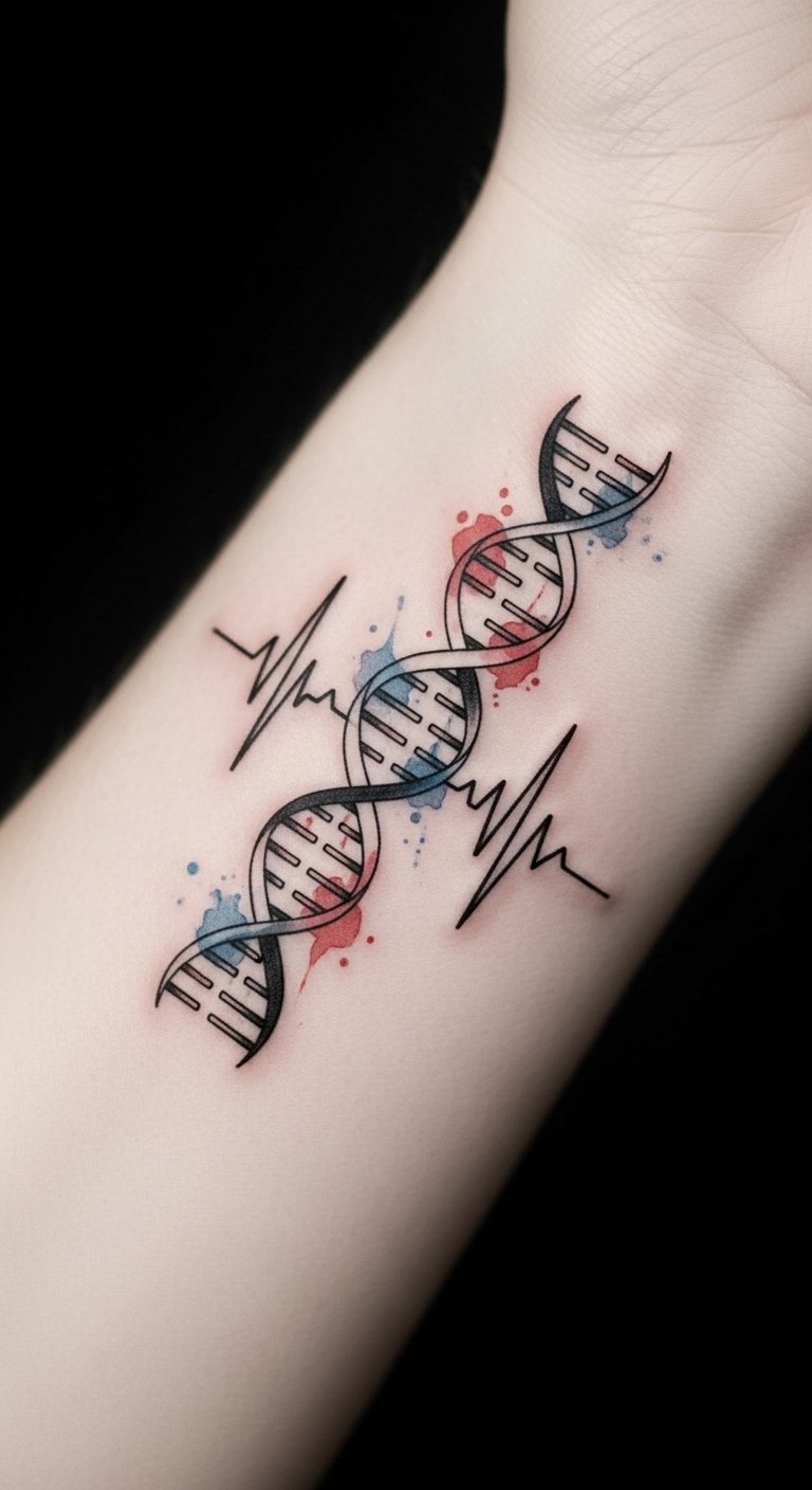Building on the concept of intertwining symbols, a DNA tattoo with a heartbeat line creates a striking visual narrative of life and identity.