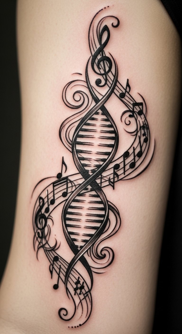 Symbolically this design marries genetic identity (the helix) with lived experience and emotion (the music), evoking movement, memory, and self-expression. The placement allows visibility or concealment depending on mood: forearm for daily affirmation and sharing, ribcage for intimate, private meaning.