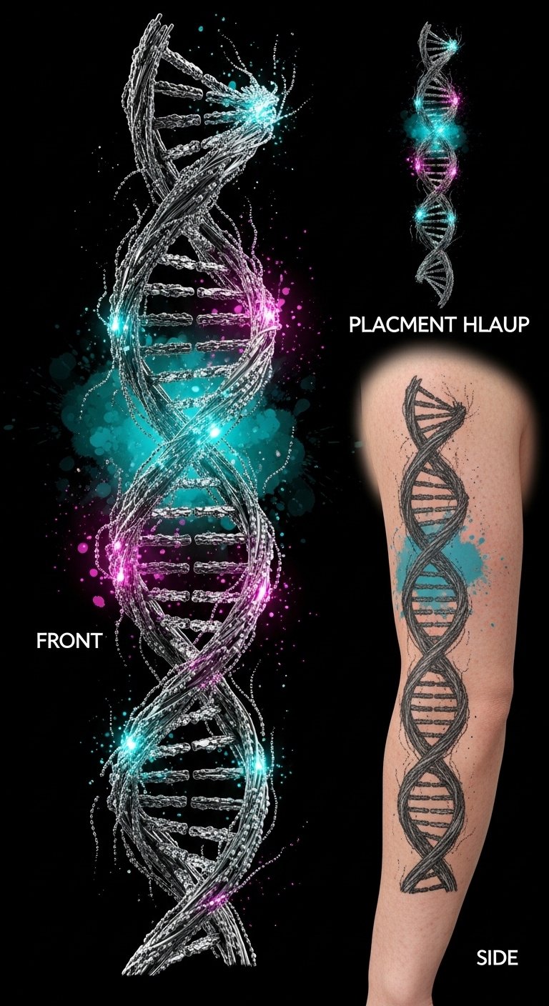 The design symbolizes the union of science and art—the helix as identity and heritage, the geometry as balance and order—evoking introspection and confidence; ideal placement follows the body’s natural lines (forearm, spine, or calf) so the flow and fractal extensions feel organic and personal.