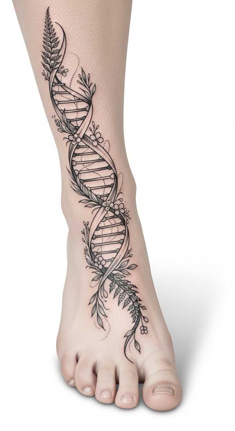 This design wraps the helix around the ankle and arches across the foot to create movement with each step, symbolizing continuity, heritage, and personal evolution. The botanical accents soften scientific geometry, evoking growth and rebirth, while muted teal tones add quiet individuality without overpowering the foot’s natural contours.