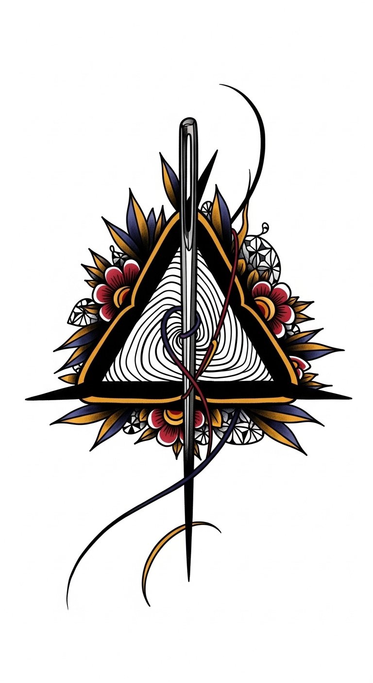 A bold, stylized tattoo concept that literalizes the metaphor: an oversized, vintage sewing needle rendered in dark, resilient steel with subtle patina, piercing through layered textures—heavy denim, leather, and ornate embroidered fabric—while threads of vibrant color trail and wrap into flowing, fearless patterns. Small details like tiny sparks at the needle tip and faint stitch marks emphasize durability and endurance; the composition balances grit with artistry. Symbolically, the design celebrates resilience, creative confidence, and the courage to tackle difficult projects; emotionally it evokes empowerment and lasting craftsmanship. Ideal placements are the forearm or calf for visibility and scale, or the upper back for a larger, more detailed piece.