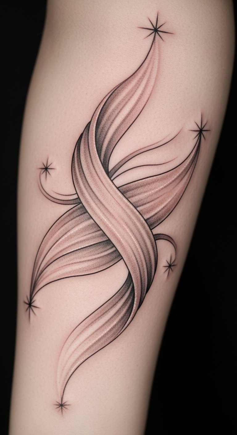 This design symbolizes the convergence of technical mastery (star-needle sparkles) and tactile softness (reverse-needle shading), evoking calm, invitation, and creative confidence; ideal on the forearm or shoulder where flowing movement and touch reinforce the tattoo’s tactile, dreamy emotion.