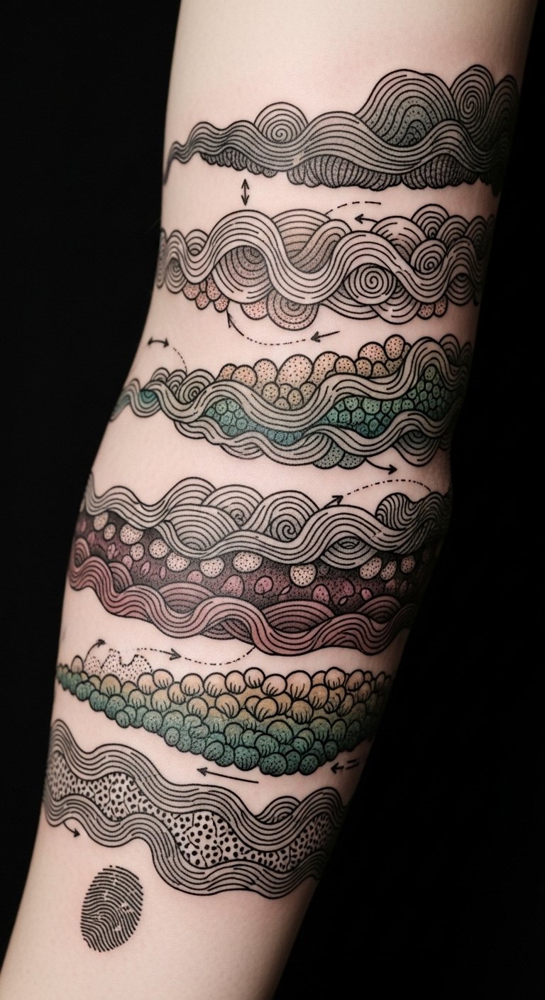 The design symbolizes the balance between deliberate technique and organic creativity, evoking calm confidence and tactile intimacy; it fits places where movement and visibility enhance the narrative—forearm for daily reminder, shoulder blade for a personal emblem, or calf for a statement that flows with the body.
