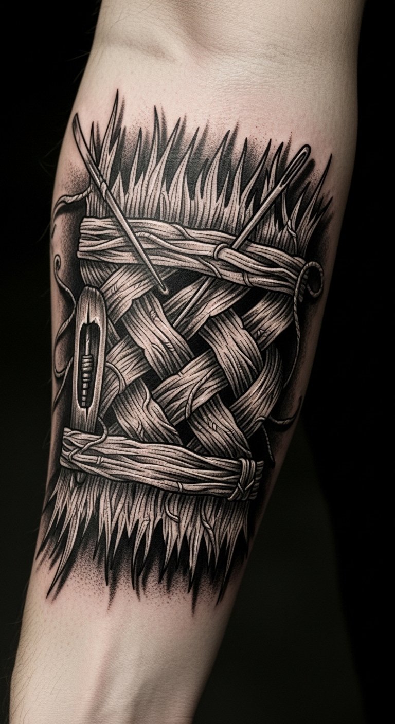 The design symbolizes resilience and hands-on creativity, evoking tactile memory and the pride of skilled craft; place along the outer forearm or calf to mirror the motion of weaving and allow the textured band to wrap visually around the limb, conveying strength and artistic identity.
