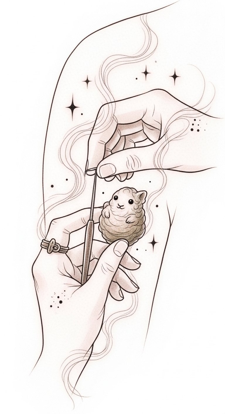 This tattoo symbolizes creativity, transformation, and tactile craftsmanship—the hand and needles represent skill and intention, the forming wool creature embodies evolving ideas brought to life, and the floating fibers and stars suggest inspiration and wonder.
