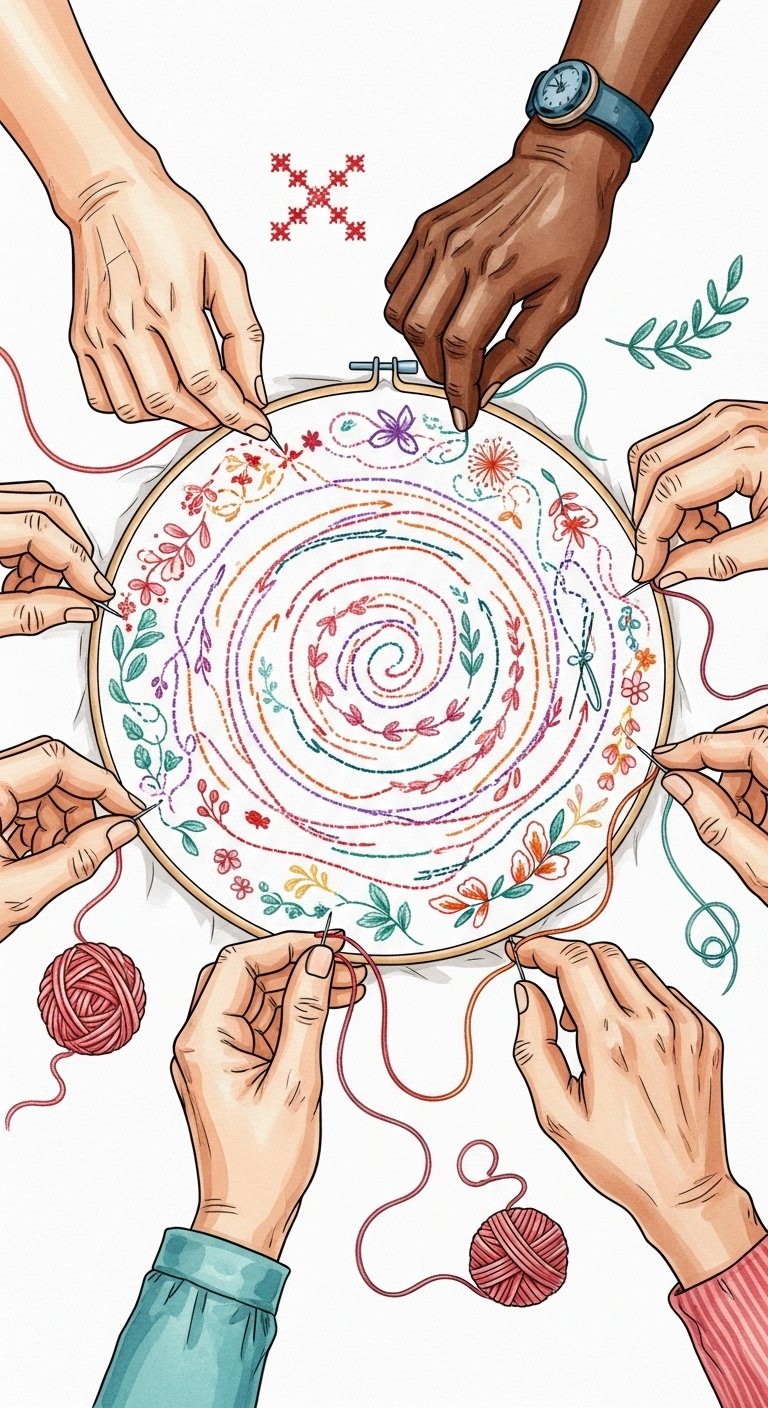This design symbolizes inclusivity and the emotional warmth of shared craft: the hands and stitching form a protective, ongoing circle representing connection and continuity; technique icons honor skill diversity while florals soften and humanize the image.