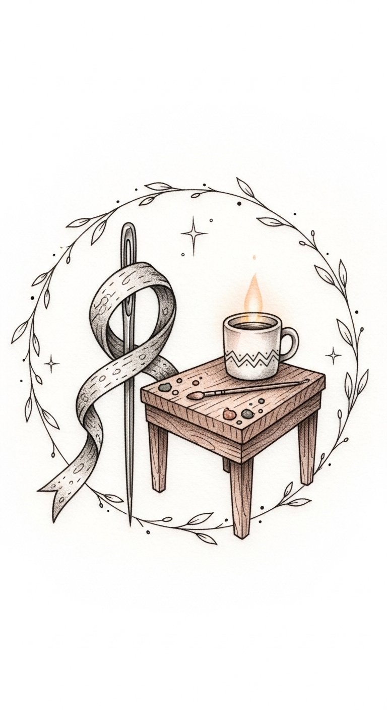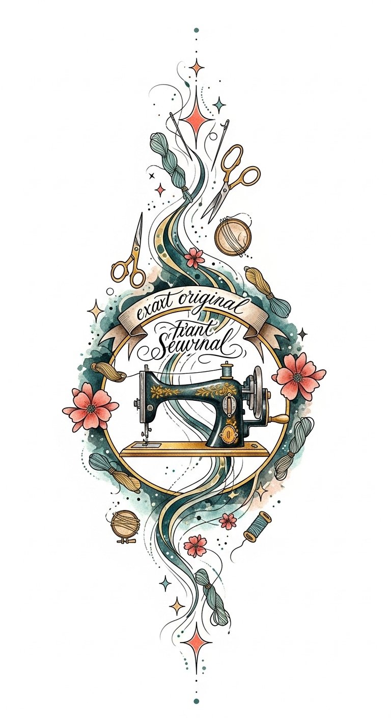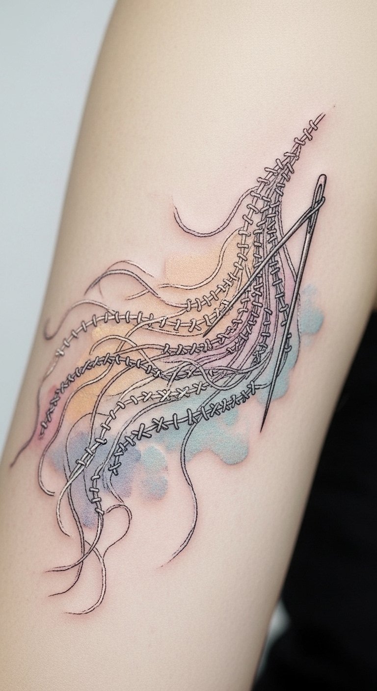 A tattoo concept that places a trio of stylized all-purpose needles entwined with threads forming a subtle infinity loop, set against a faint patchwork background of fabric squares and quilting stitches; include small icons for sewing, quilting, and mending (scissors, thimble, patch) integrated into the negative space, fine-line detail, gentle shading, and muted earthy colors for a timeless craft aesthetic, sized for forearm or shoulder. The design symbolizes skill, versatility, and creative freedom—needles as trusted companions that mend and create continuity—evoking steady calm and pride in handiwork; ideal on the inner forearm for visibility during projects or the shoulder to represent support and craftsmanship.
