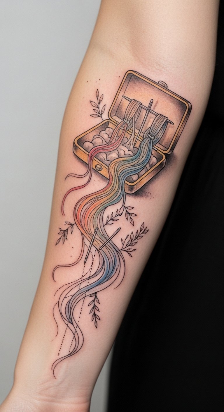 A sculptural forearm tattoo blending a detailed needle and thread motif with organic hybrid materials—feathers, metallic filaments, and watercolor washes—intertwined into a flowing band. Symbolically, the needle represents skill and the threads are pathways of creativity; hybrid elements show adaptability and innovation. The design evokes curiosity and fearless experimentation, celebrating personal growth and artistic freedom. Ideal placement is the outer forearm or calf where the elongated composition follows natural lines, allowing visible expression and easy concealment when needed.