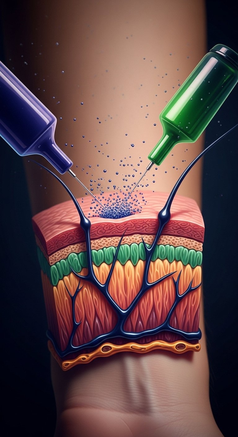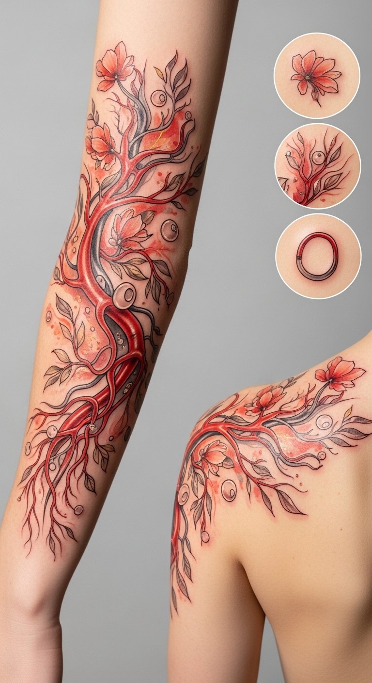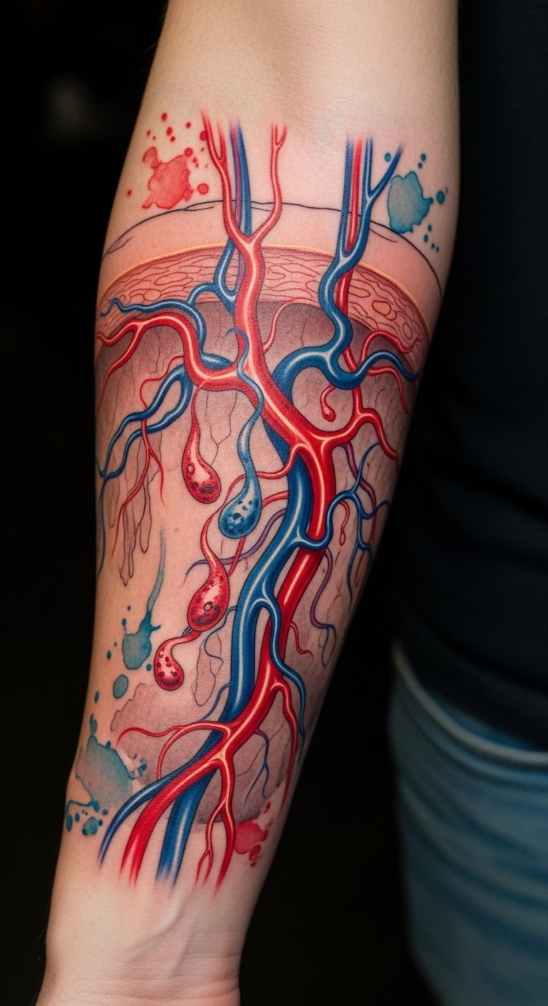 Symbolically the design marries scientific precision and personal permanence: vessels represent life and care, fibroblasts as guardians of color, and concentrated pigments as memory and identity. Emotionally it balances clinical beauty with intimate meaning, suited for placement on the upper arm or ribcage where it can be both shown and protected, sized to flow with muscle contours so the anatomical lines feel like part of the body’s natural architecture.