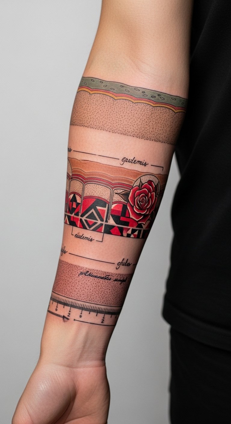 Understanding the thickness variation of the upper dermis is vital for achieving ideal tattoo results. Dermal thickness influences how well ink retains its vibrancy and affects tattoo visibility over time. In areas where the upper dermis is thicker, tattoos may appear bolder and more defined. Conversely, thinner regions can result in less pronounced designs, making it essential to take into account skin anatomy during the tattooing process. The imagery uses the skin cross-section as a metaphor for permanence versus fragility: bold shapes in thicker dermis zones symbolize resilience and lasting memory, while the softer, faded lines in thinner zones evoke transience and vulnerability. Emotionally, it balances confidence with tenderness—celebrating what endures and honoring what fades. Placement on the inner forearm keeps the concept visible for reflection, while allowing the artist to match the design to the local skin anatomy for optimal longevity.