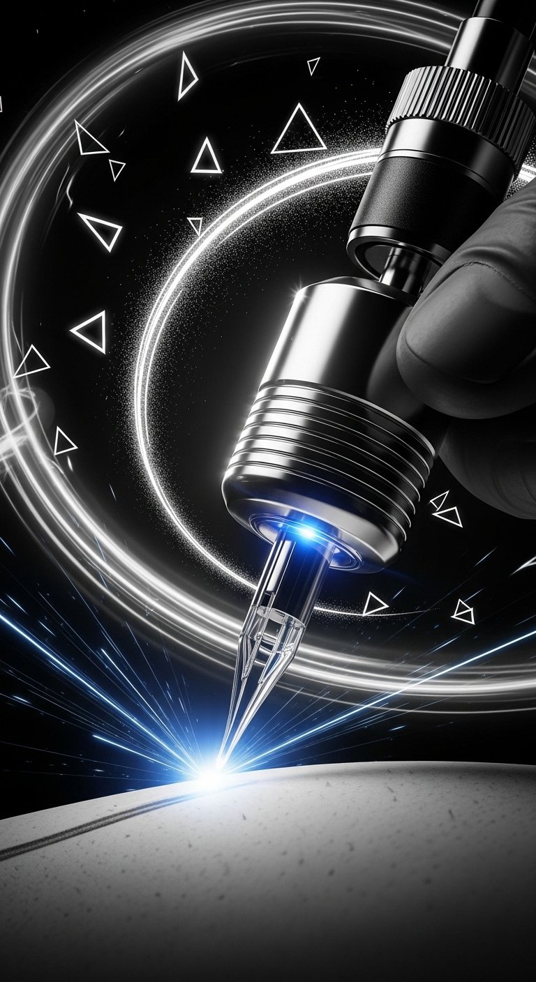 This advancement not only elevates the artistry but also enables you to express your individuality with confidence. The design symbolizes the fusion of technology and human expression: the machine as a modern instrument of creativity, the swirling lines representing energy and motion, the geometric elements hinting at precision and innovation, and the electric blue accents suggesting vitality and confidence.