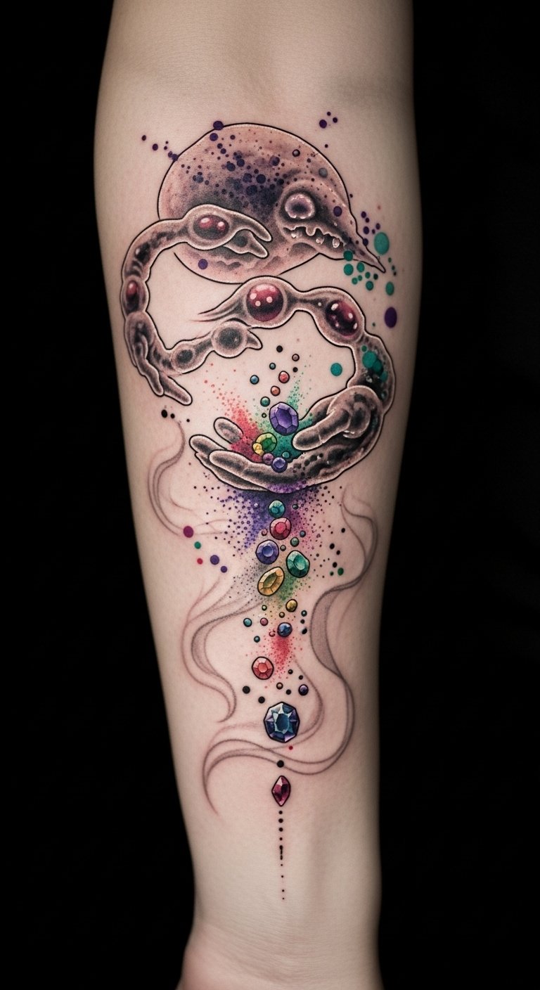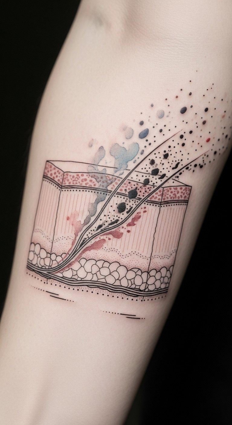 This design concept uses literal anatomy and pigment particles as metaphors for endurance and intentionality; placing it on the inner forearm or shoulder blade allows both visibility and concealability. Emotionally it speaks to care and permanence—colors that hold steady despite time—and visually guides the viewer from the surface into deeper layers, suggesting depth of meaning and the relationship between technique and lifelong expression.