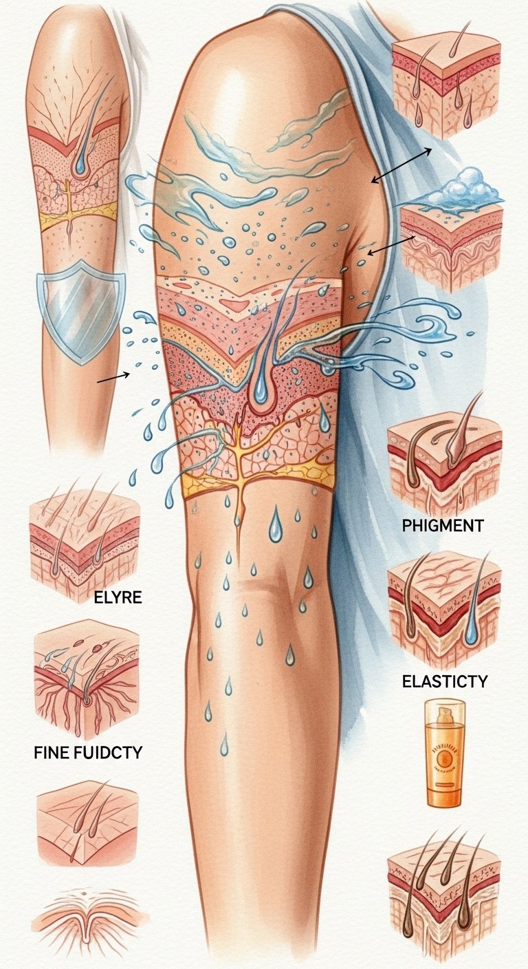 This design juxtaposes the clinical and the personal: the cross-section of skin and pigment grounds the piece in science, while watercolor-like environmental motifs and a translucent shield evoke protection and care.