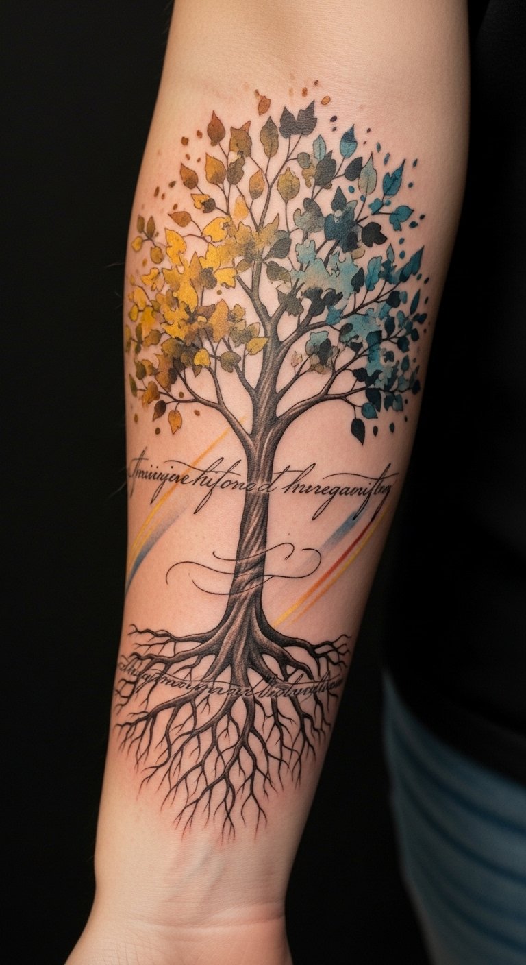 Emotionally it balances reverence for technique with celebration of personal evolution. Ideal placement is a forearm wrap so the composition can follow the arm’s contours, allowing the flowing roots and petals to interact with movement and be visible during daily gestures.
