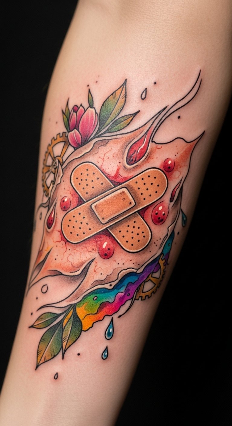 The design symbolizes the journey from vulnerability to renewal, using the bandage and peeling textures to represent protection and transformation while the vibrant colors beneath convey resilience and lasting beauty. Clockwork gears and droplets evoke the passage of time and the importance of consistent care, and the inner forearm placement allows the wearer to observe and reflect on the healing process intimately, creating an emotional narrative of recovery, patience, and pride.