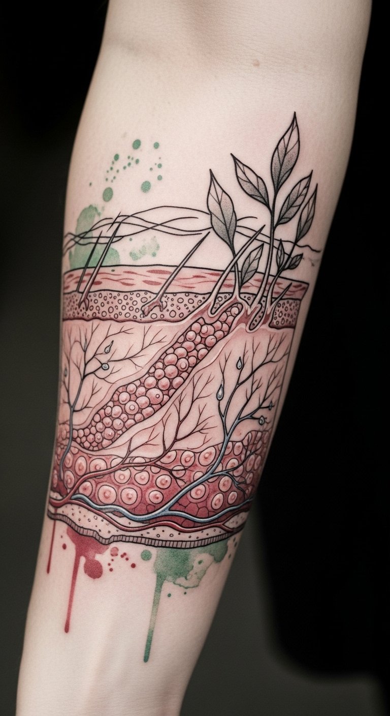 The design symbolizes regeneration and the often-overlooked biological artistry behind visible tattoos, evoking gratitude and resilience; emotionally it balances clinical anatomy with organic growth, inviting contemplation rather than discomfort.