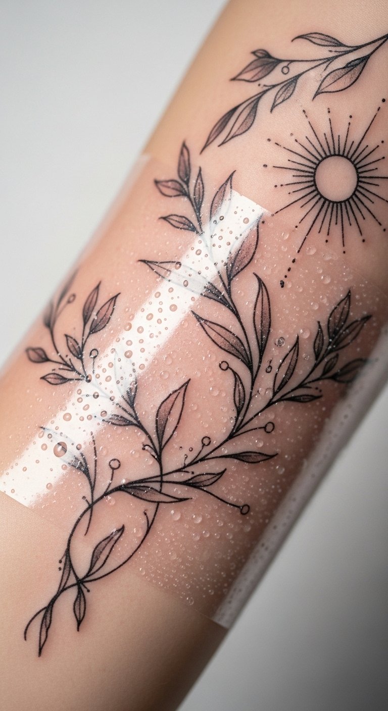 Emotionally the piece balances tenderness and strength, reassuring and instructive; placement on the inner forearm makes it visible for regular care, allows moderate size for detail, and positions the imagery where the wearer can easily see and remember aftercare routines.