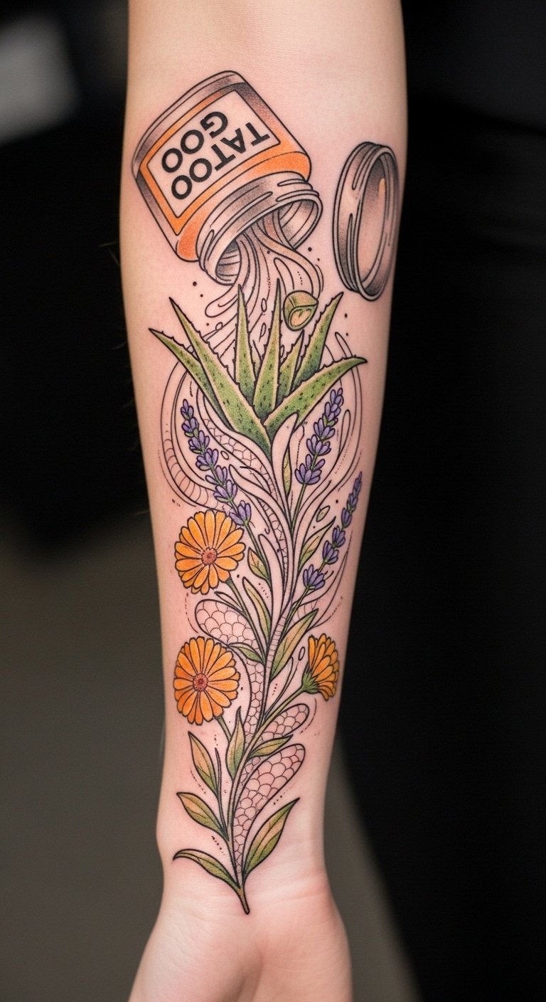 Botanical elements connote natural soothing and scientific support for skin recovery, while sparkles and filigree highlight the tattoo’s lasting brilliance and individuality.