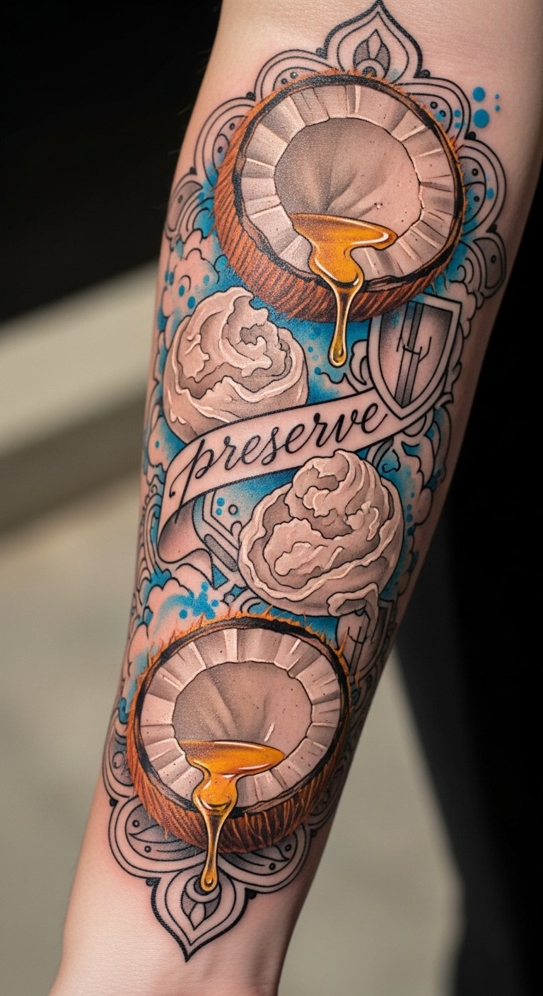 The imagery symbolizes nourishment and protection—coconut and shea as guardians of color, the script “preserve” a personal promise; the watercolor splashes evoke the emotional freshness of new ink while the filigree barrier suggests care and resilience.