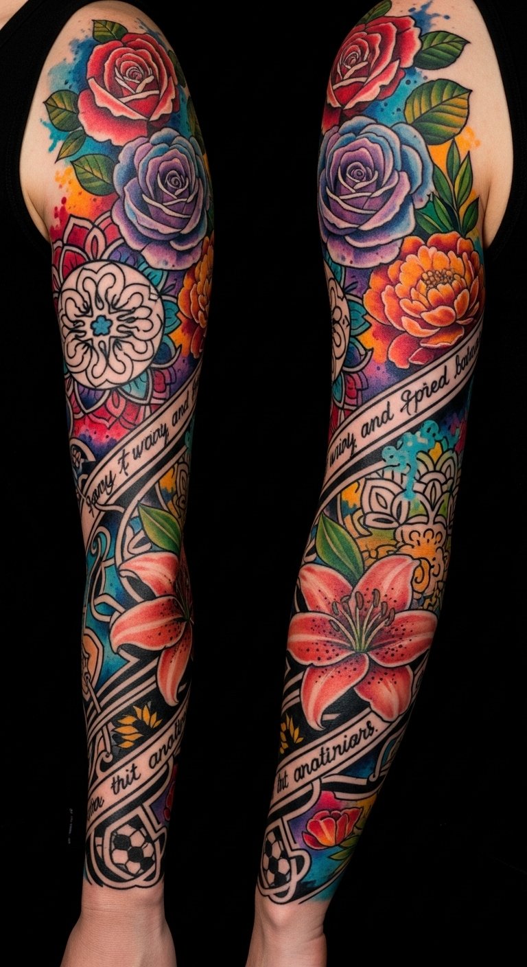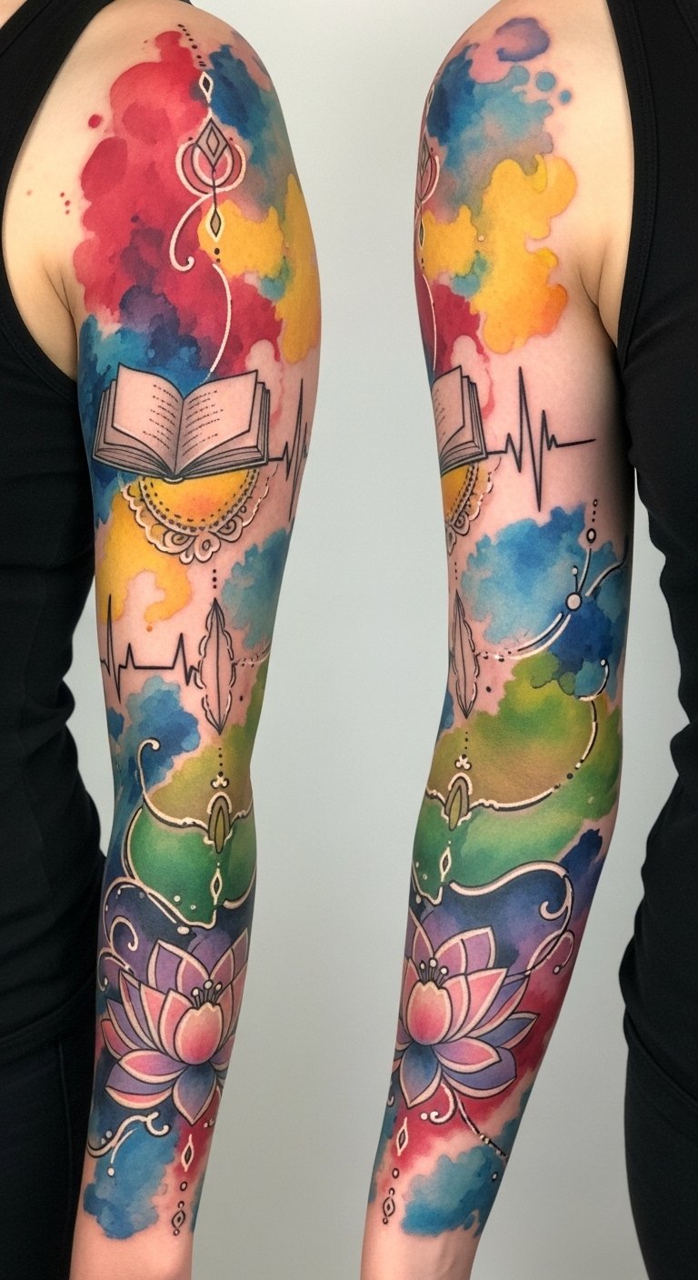 The emotional tone is protective and celebratory—colors and clarity preserved by care—best placed as a full arm sleeve where movement accentuates blending and linework, inviting close inspection and ongoing maintenance.