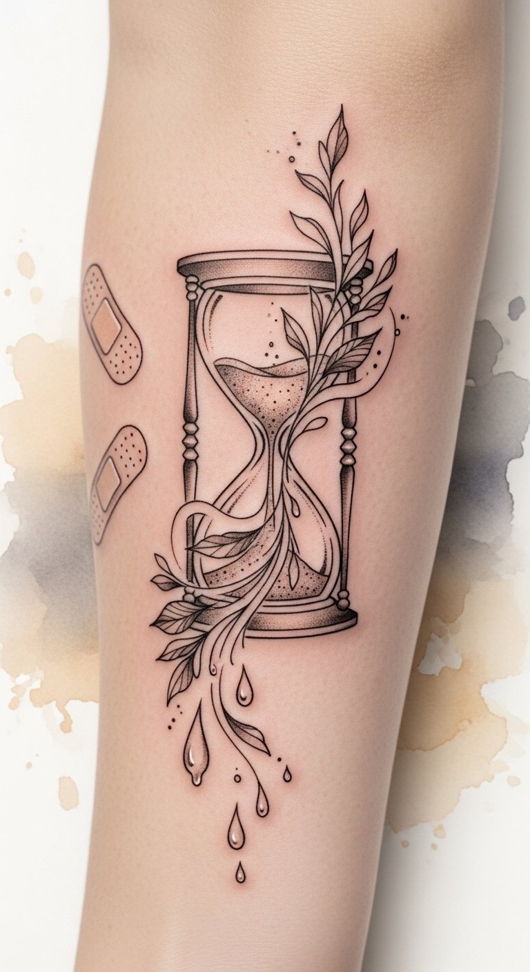 The design symbolizes attentive care and the passage of time needed for healing: the hourglass represents the scheduled intervals and patience, while the ointment droplets turning into leaves and vines evoke nourishment, moisture, and regrowth. Emotionally it conveys reassurance and mindfulness—reminders to trust one’s instincts and tend to oneself gently. Best placed on the inner forearm for visibility and personal connection, the piece works as a personal ritual marker and is sized to be easily covered during recovery if needed.