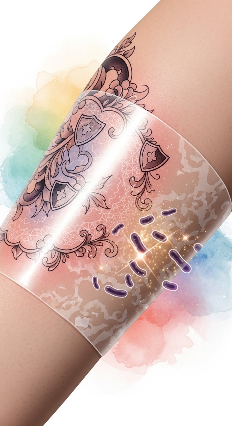 A forearm placement where the protective lace-like barrier visually cradles a fresh, colorful tattoo—this design symbolizes care, preservation, and reverence for personal expression.