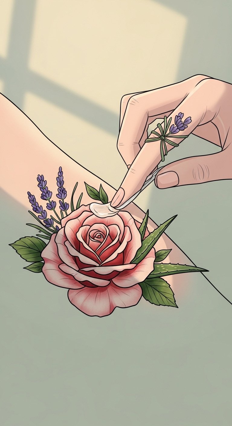 The design symbolizes care and restoration: the hand and ointment represent attentive aftercare, the blooming rose stands for healing and the vitality of fresh ink, while the integrated lavender and aloe hint at natural soothing ingredients.