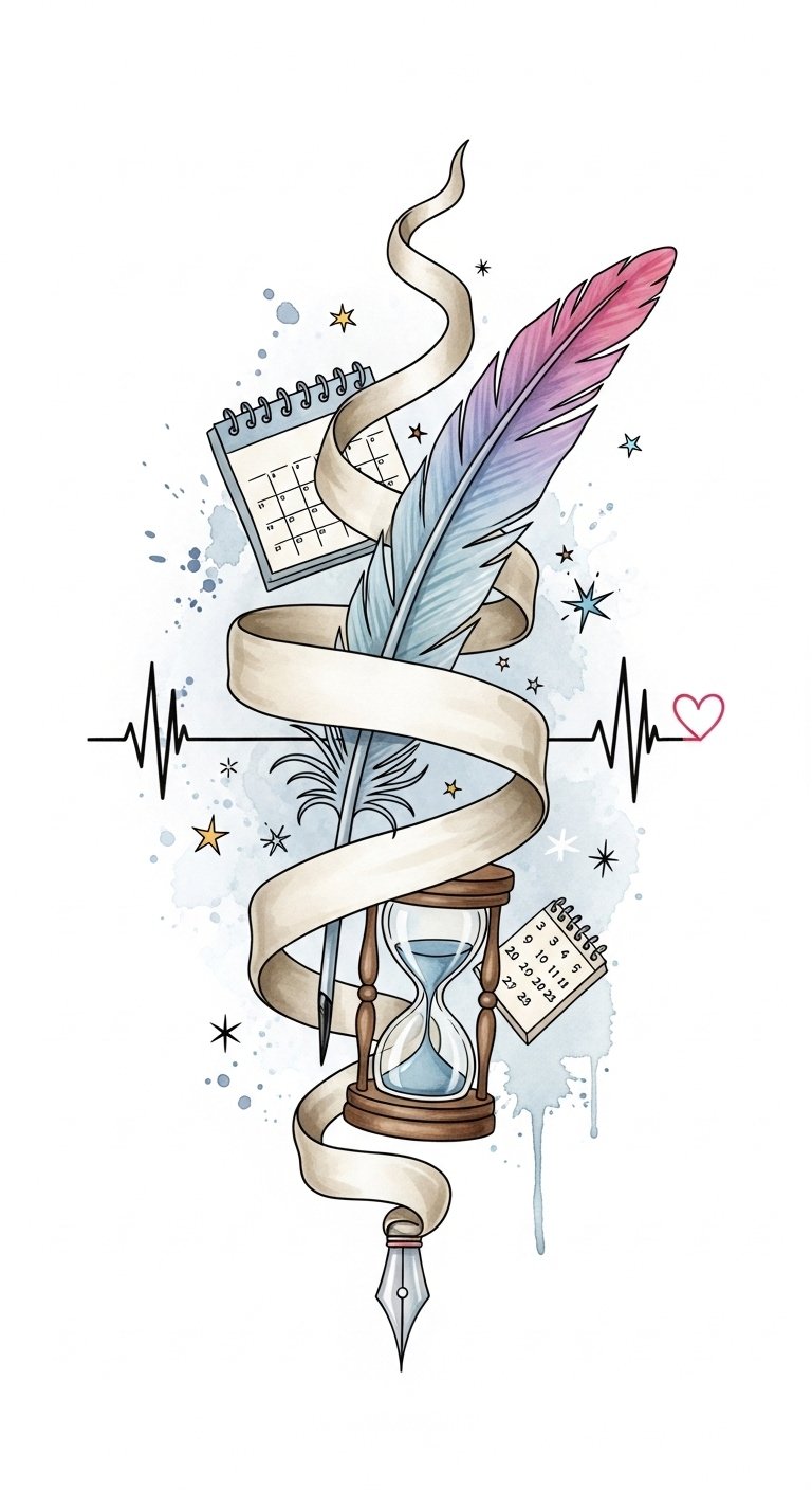 The design combines symbols of routine and preservation: the banner bearing the original text wraps like a promise, the quill represents care and intentionality, the hourglass and calendar evoke disciplined timing, and the heartbeat line ties the ritual to life and longevity.