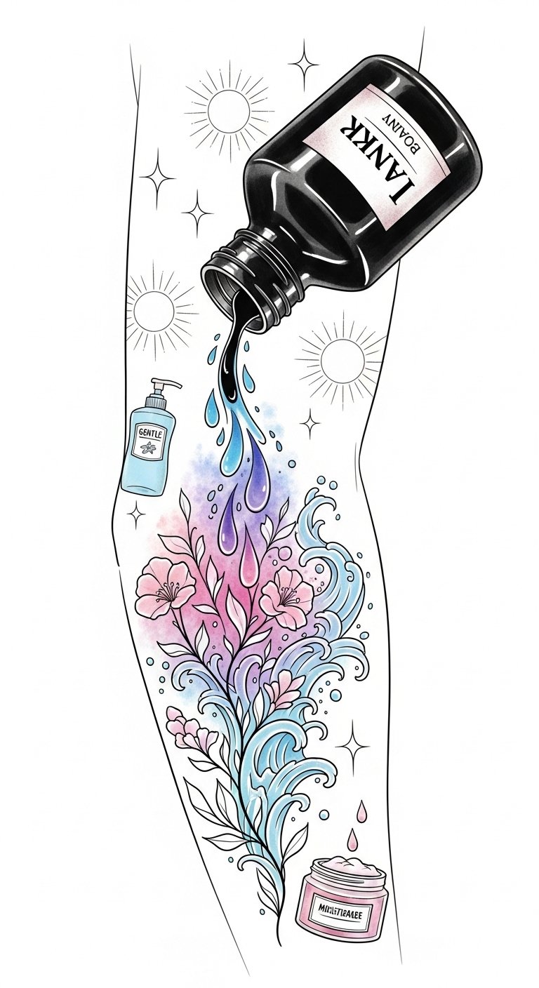 These simple steps will keep your artwork radiant and true to life for years to come. The design symbolizes care and protection—the ink bottle as origin, flowers and waves as growth and continuity, sun motifs as vigilance against fading, and cleanser/moisturizer icons as daily rituals; it evokes calm responsibility and pride in one’s skin art, suited for placement on the upper arm or calf where visibility and curvature enhance flow.