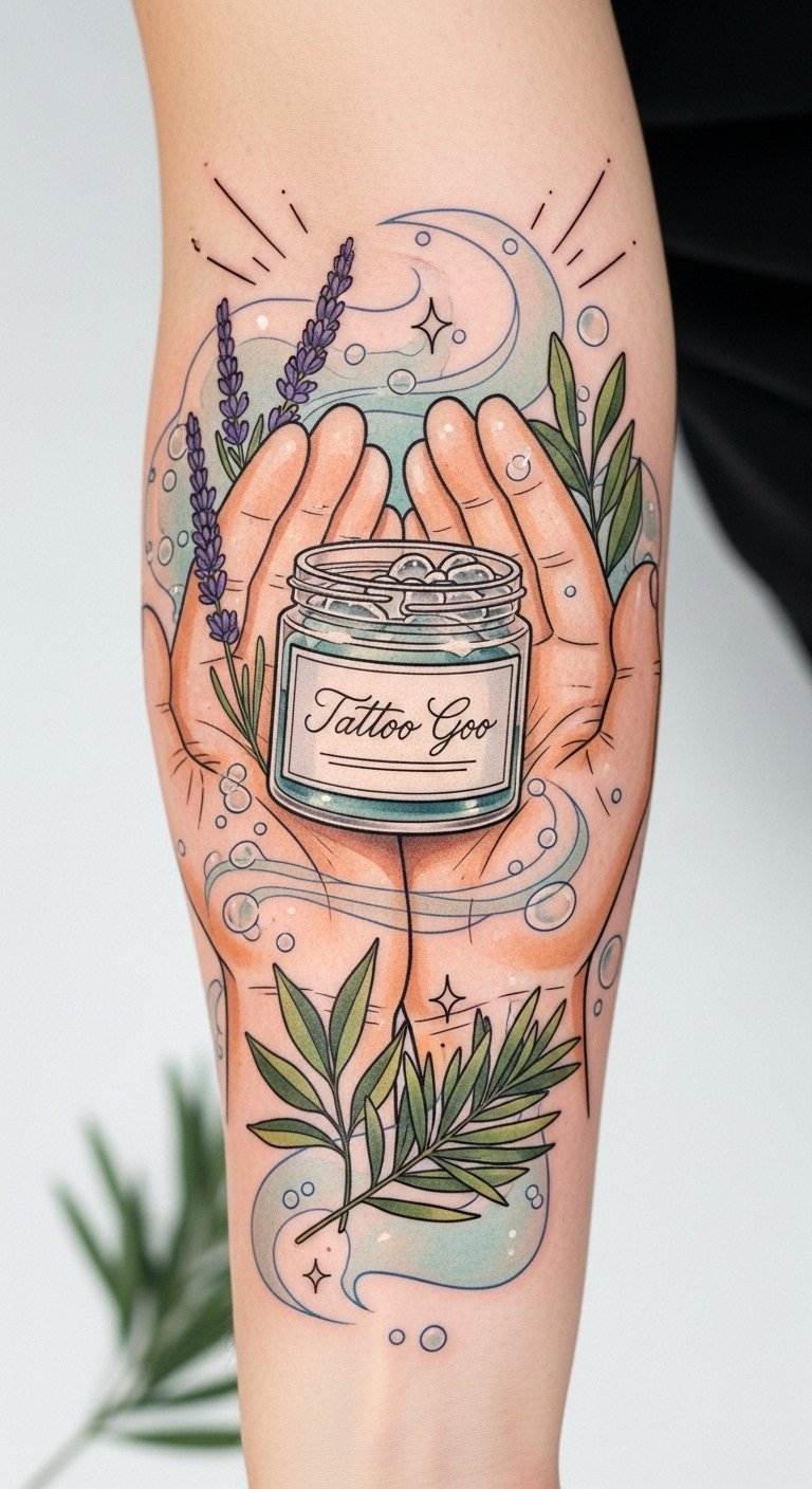 A delicate, minimalist forearm tattoo pairing a small pea-shaped balm container with fine-line hands gently dabbing and massaging it into stylized skin; include subtle breathable mesh motifs and fading ink elements to symbolize the risk of suffocation, executed in soft black and muted green watercolor accents. This design symbolizes careful stewardship and restraint, evoking calm responsibility and mindful healing; its emotional tone is tender and instructive, ideal for an inner forearm or wrist placement where the wearer can see it often and be reminded to care for their ink with patience.