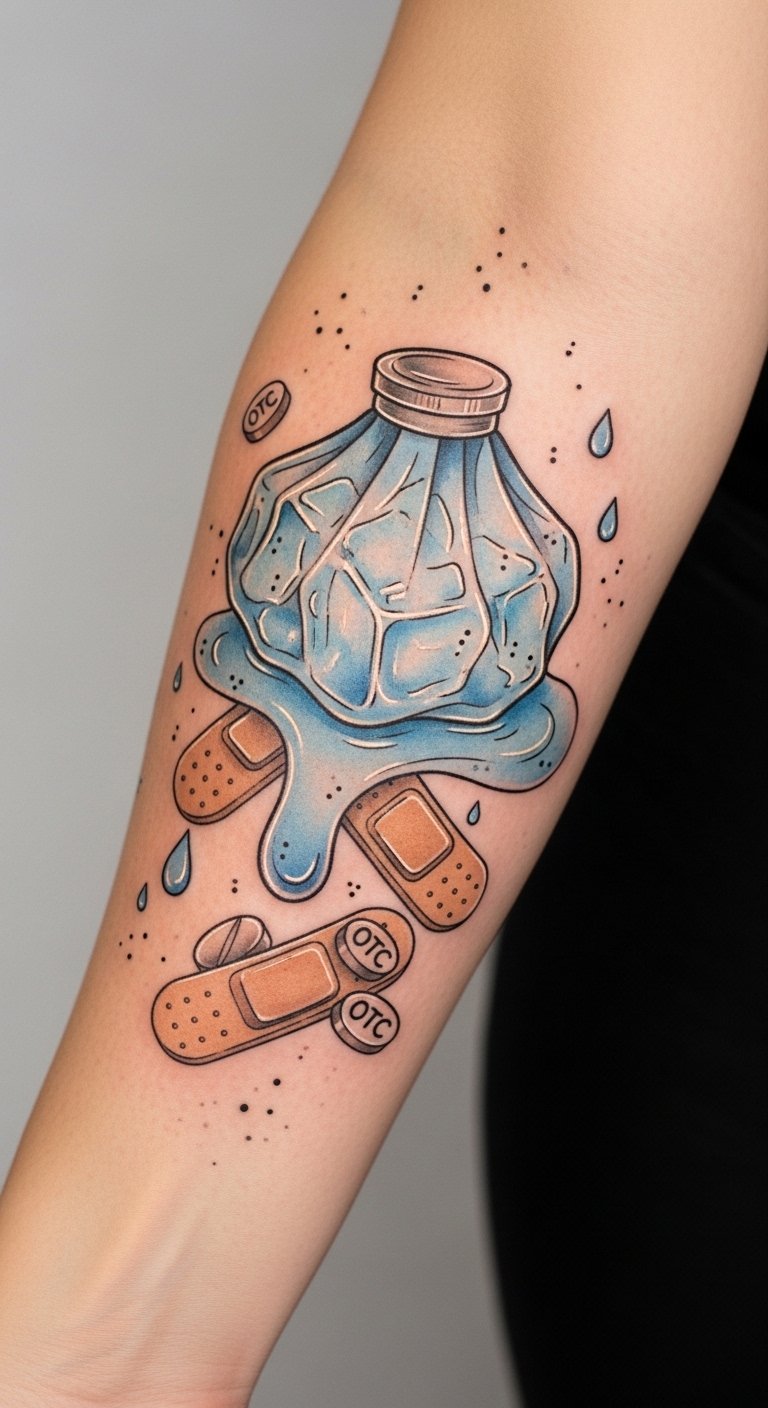 This design symbolizes the transition from acute discomfort to steady recovery: the melting ice pack represents temporary relief, the bandage wraps signify protection and careful aftercare, the cream droplets embody soothing nourishment, and the OTC pill silhouettes nod to pragmatic comfort when needed.