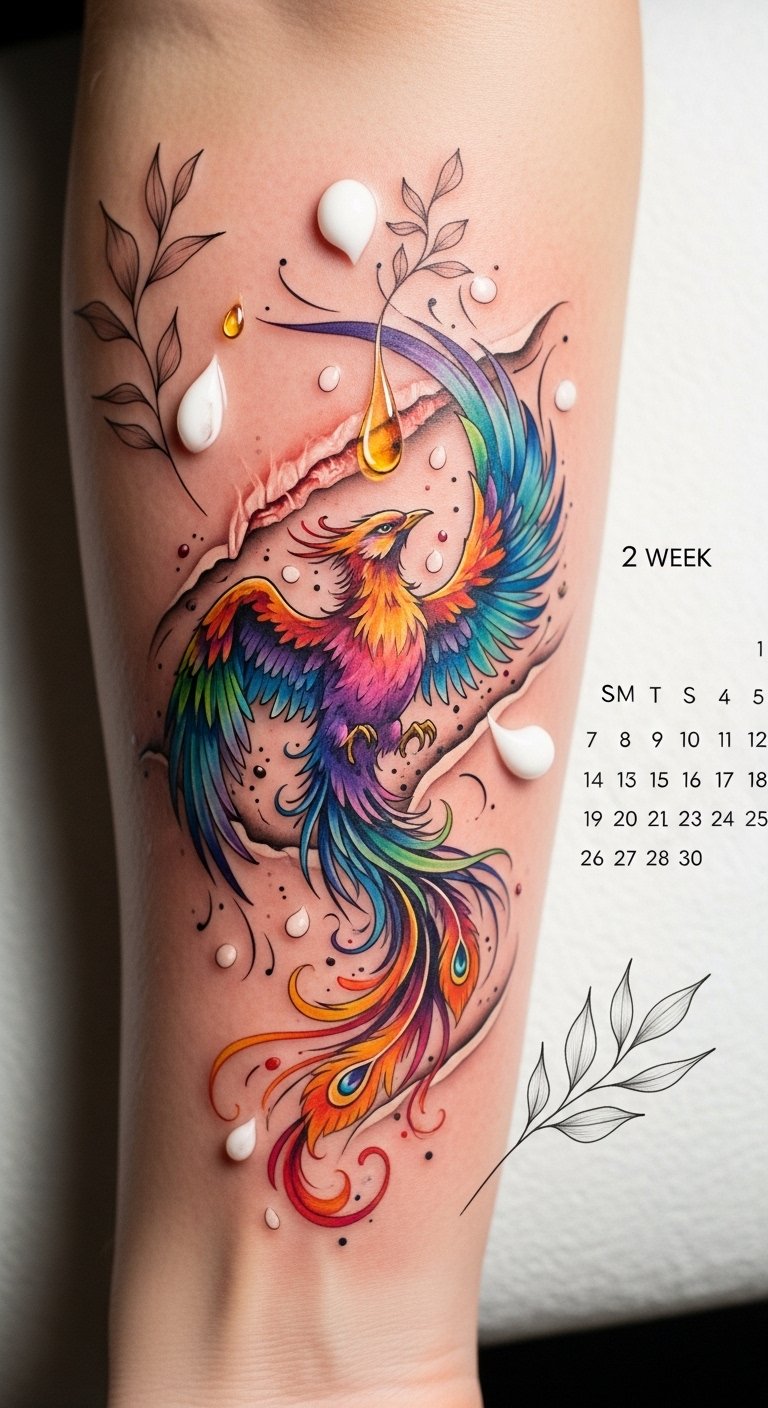 The phoenix symbolizes rebirth and resilience, the translucent skin layers and lotion droplets emphasize ongoing healing and care, and the botanical accents convey nourishment; placed along the forearm where movement and visibility mirror personal expression, the piece evokes gentle renewal and pride in healed, lasting art.