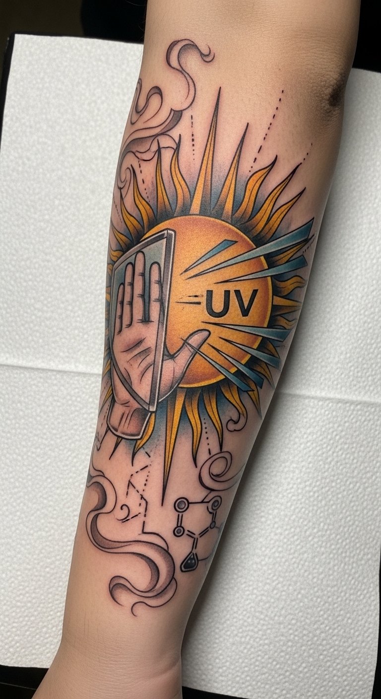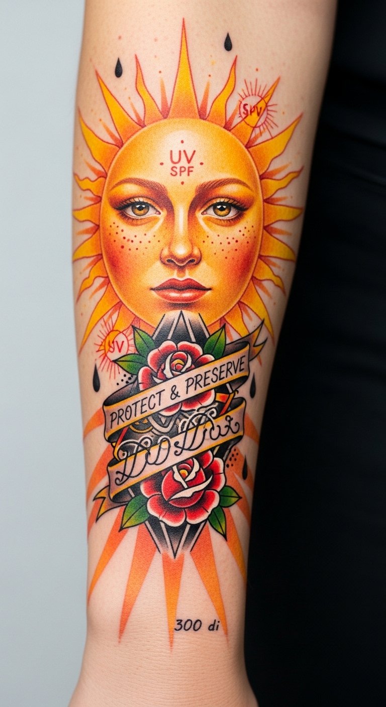 The inclusion of tiny SPF droplets and UV symbols marries practical advice with aesthetic detail, evoking a gentle but urgent feeling of stewardship. Best placed on the outer forearm for visibility and easy sun protection, the piece invites daily interaction—both as a statement of personal style and as a prompt to preserve one’s art through mindful habits.