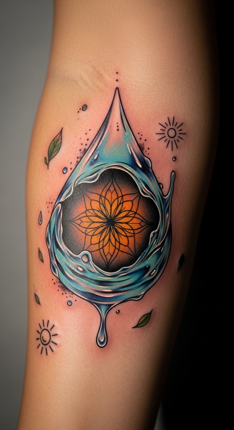 This design weaves practical care into a visual narrative: a stylized, flowing vine of leaves and droplets wraps around a central, timeless emblem—an hourglass with sun rays above and a water droplet beneath—symbolizing the passage of time, protection, and nourishment. Fine-line detailing suggests gentle moisturizing and careful maintenance, while soft gradients and open spaces evoke breathability and balance. Emotionally, it conveys commitment, patience, and self-respect—an enduring reminder to honor both the artwork and the body that carries it. Ideal placements are the forearm, calf, or along the ribcage where the length of the vine complements natural contours and remains visible for daily care cues.